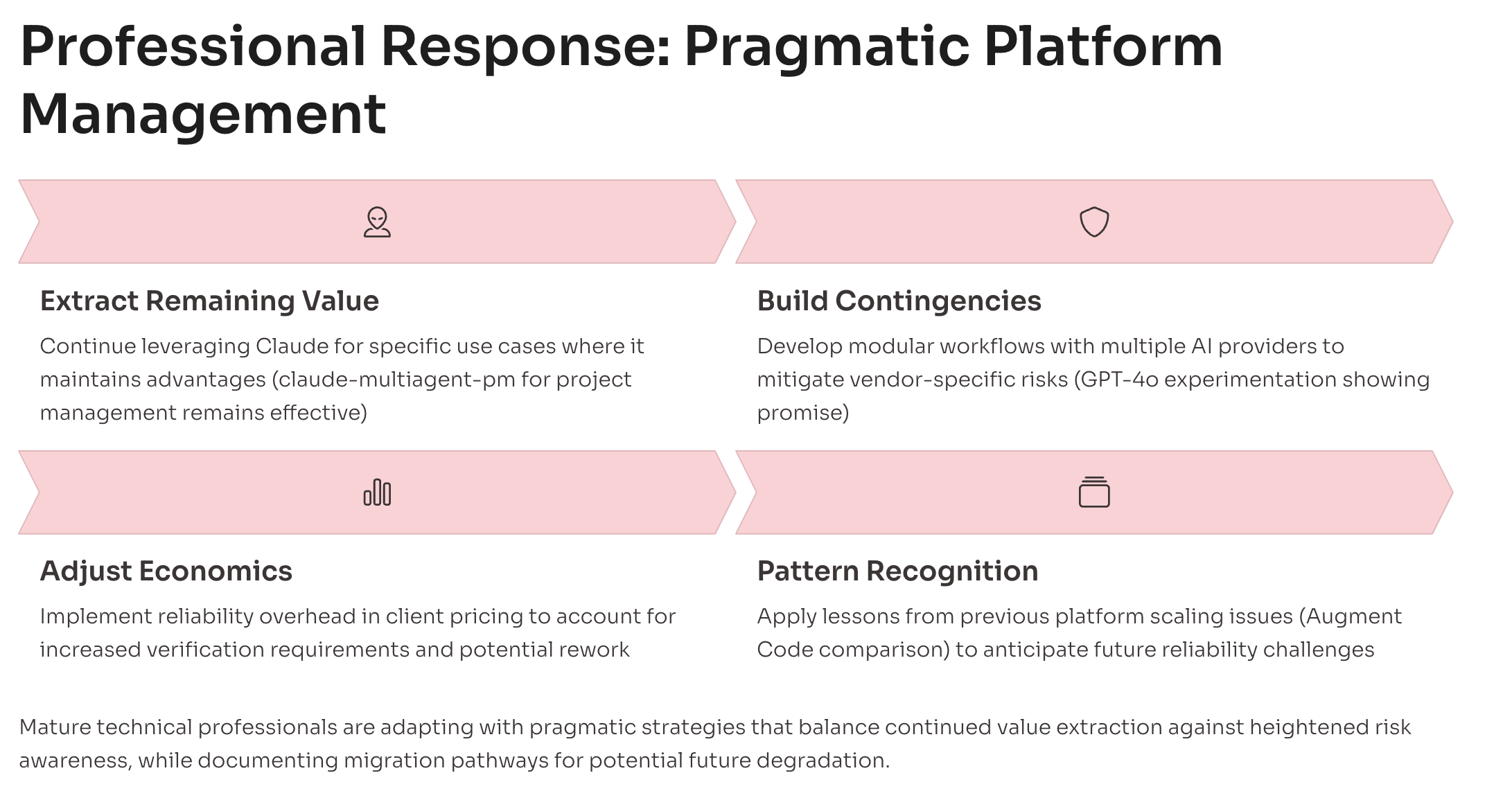 Where I previously charged for development time, I now include overhead for managing platform limitations and implementing workarounds. Clients understand this when you explain it honestly: "The AI tools are powerful but require additional engineering for production reliability." This transparency has actually strengthened client relationships rather than weakening them.