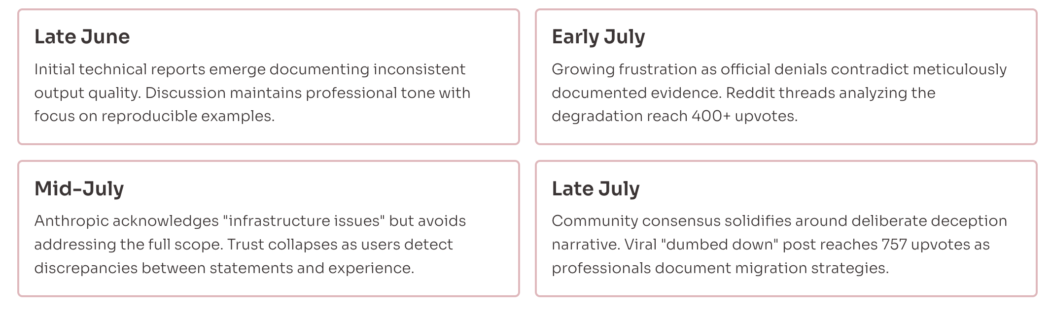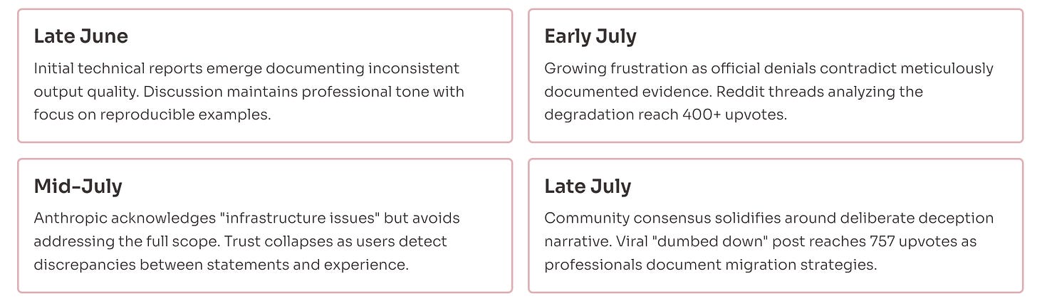 Late June: Users report quality issues, seek technical explanations Early July: Official responses deny systematic changes, attribute issues to user perception Mid-July: Anthropic acknowledges infrastructure issues causing degraded responses Late July: Community consensus that initial denials were intentionally misleading