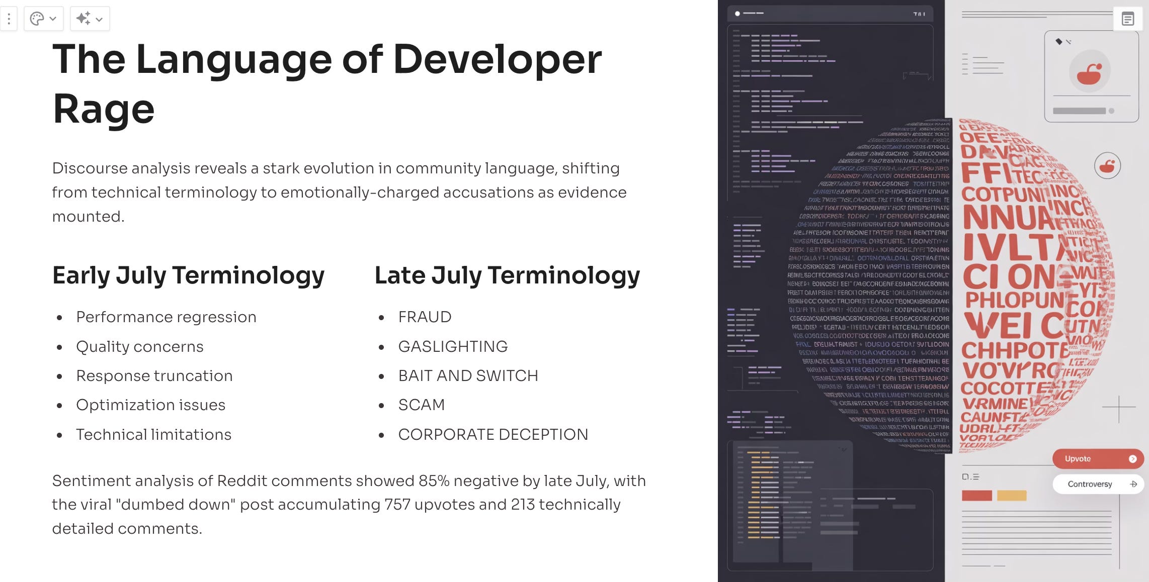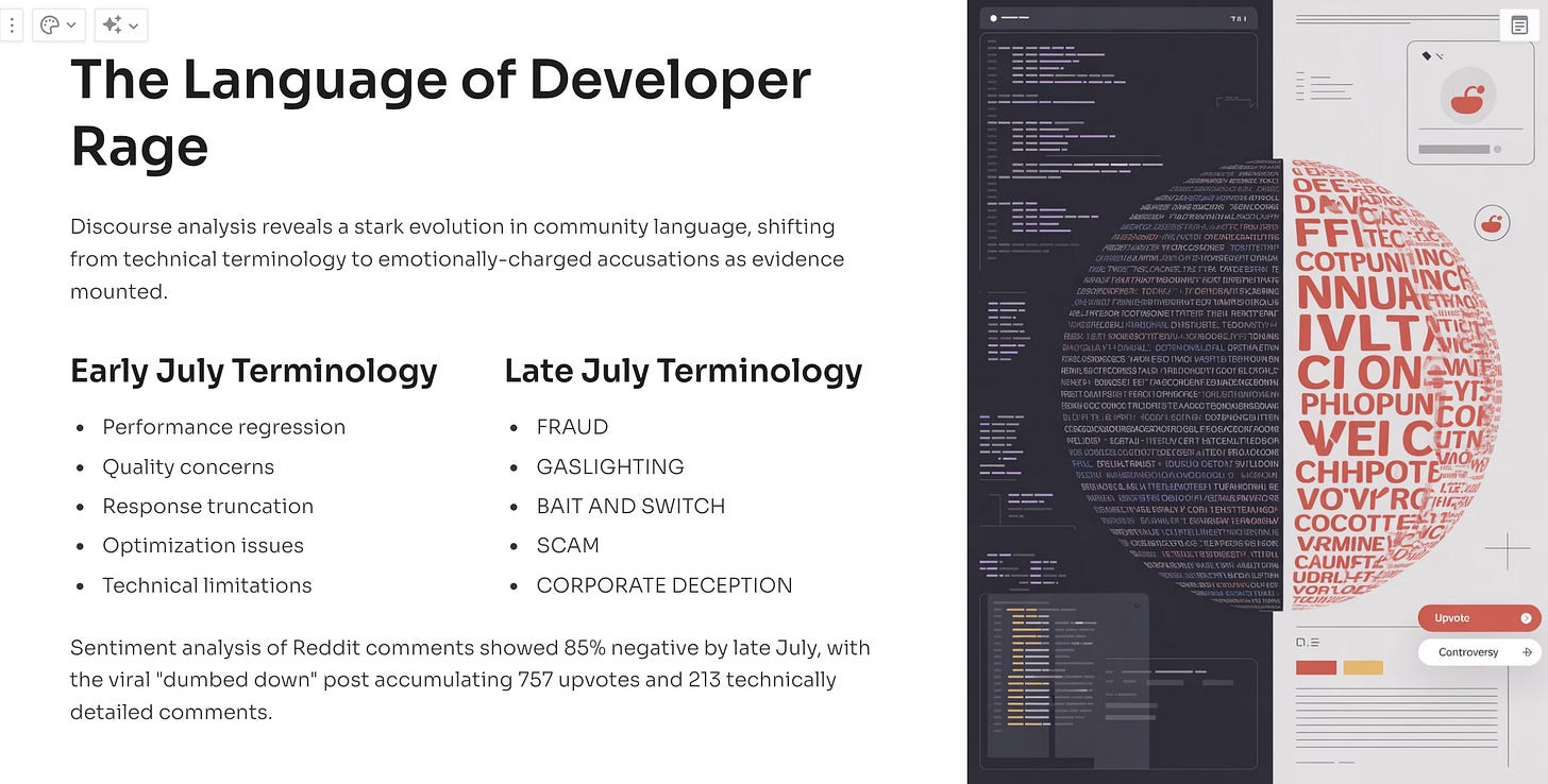 The progression of language on r/ClaudeAI over the past month reveals how quickly technical communities can turn hostile when they feel dismissed. Early July posts used measured technical language: "experiencing issues," "performance degradation," "quality concerns." By late July, the tone had shifted dramatically.