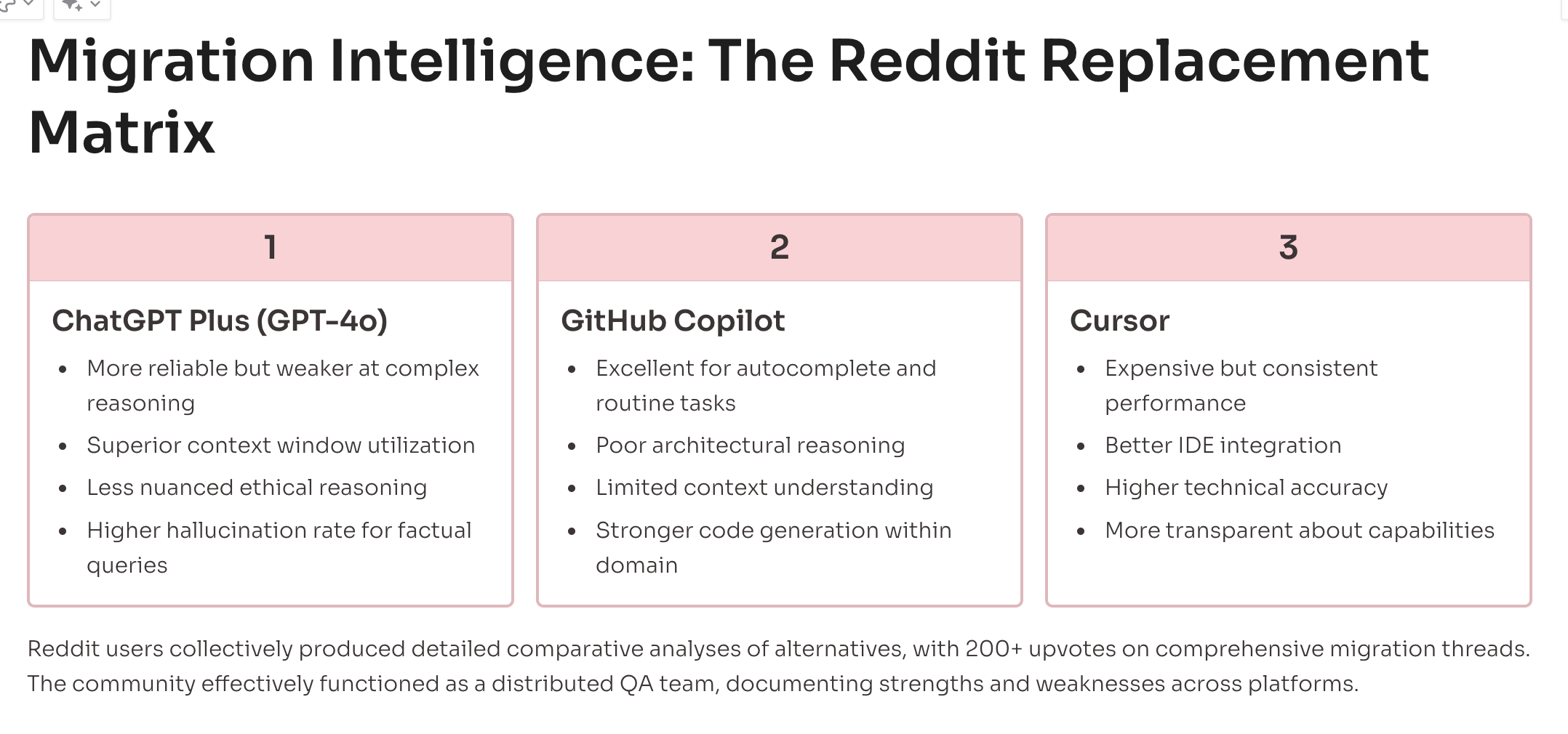 One thread titled "Claude replacement matrix" gained 200+ upvotes, featuring a detailed comparison grid of features, reliability, and cost across six AI coding platforms. The community effort represents thousands of hours of collective testing—valuable market intelligence that Anthropic is losing along with the users.