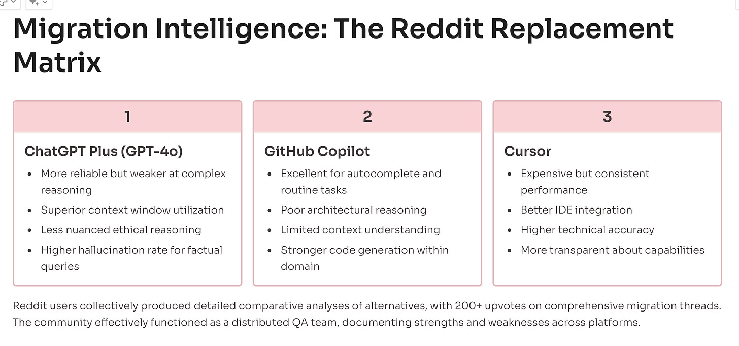 The Reddit community has become an informal migration support group, with detailed threads comparing alternatives and sharing transition strategies. The discussions reveal sophisticated analysis of competitive AI tools, often more detailed than official product comparisons.