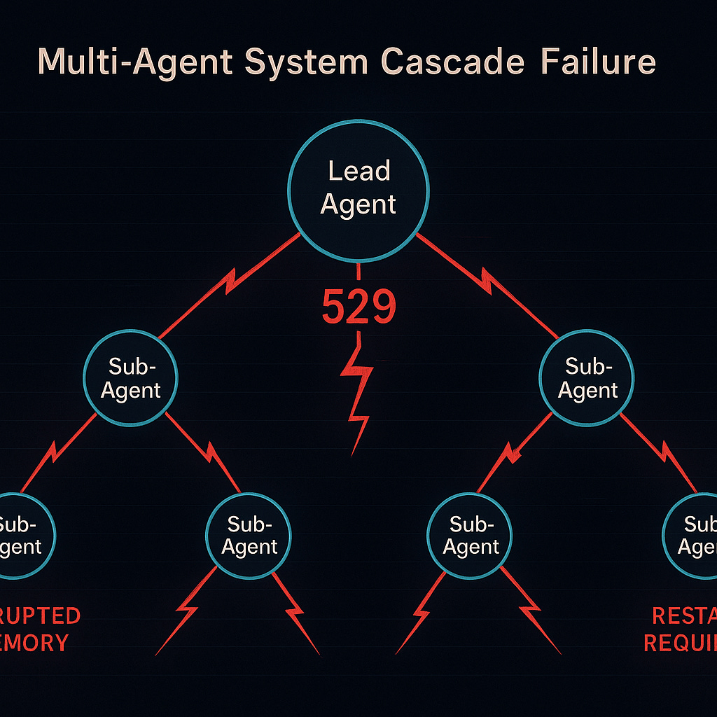 But these orchestration systems create multiple failure points. Anthropic's own research acknowledges that "minor system failures can be catastrophic for agents." When you're running a lead Claude Opus 4 agent coordinating multiple Claude Sonnet 4 subagents, a single 529 error can disrupt dependent agents. Here's a concrete example: during a recent documentation update workflow, one user reported their lead agent failed during context compaction, which left three subagents in inconsistent states with corrupted shared memory—requiring a complete restart that lost 45 minutes of work.