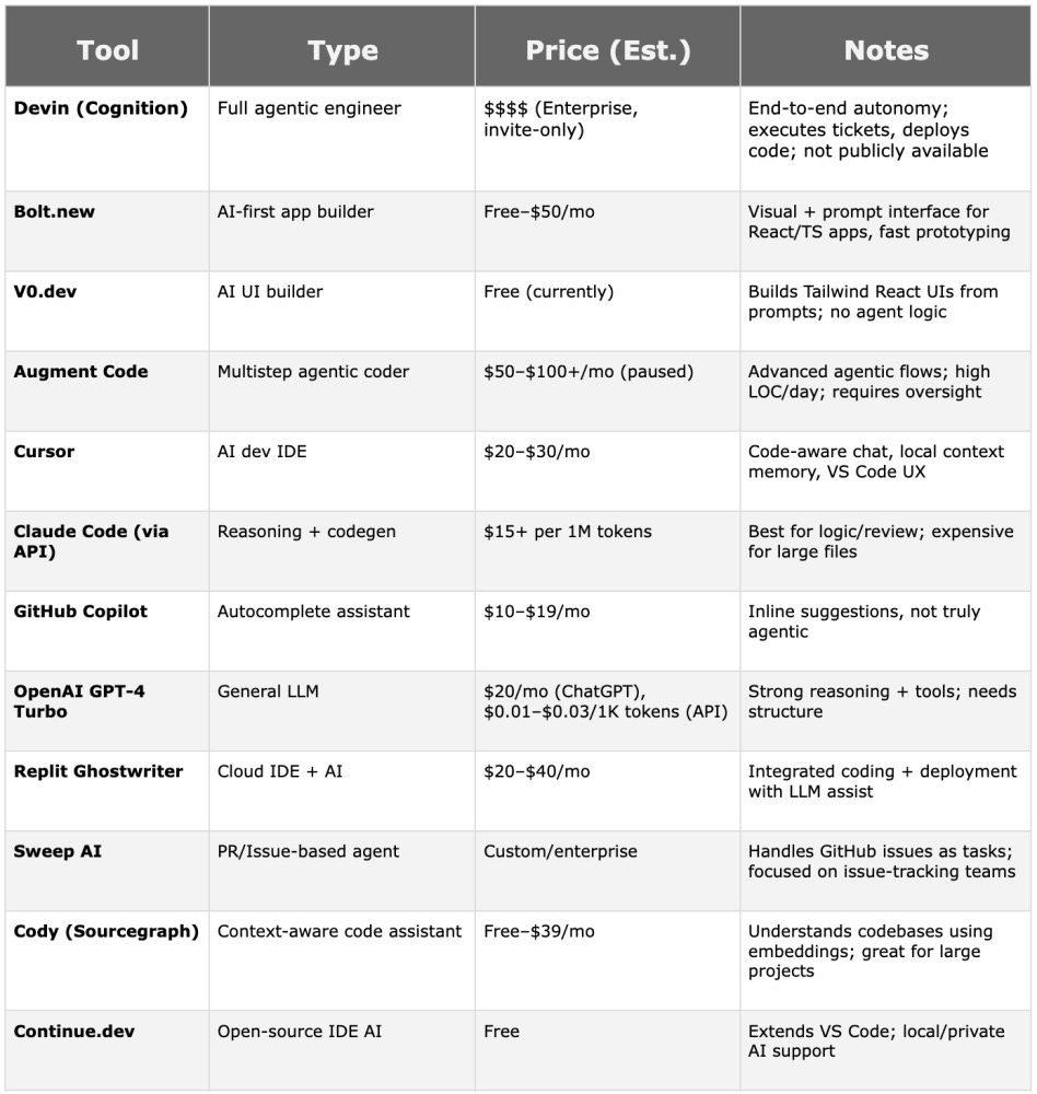 Augment Code: Exceptional at high-volume code generation but the startup has struggled under heavy usage. An impressive alternative to Cursor’s limited agentic capabilities. Keep an eye on their pricing and scaling strategy.