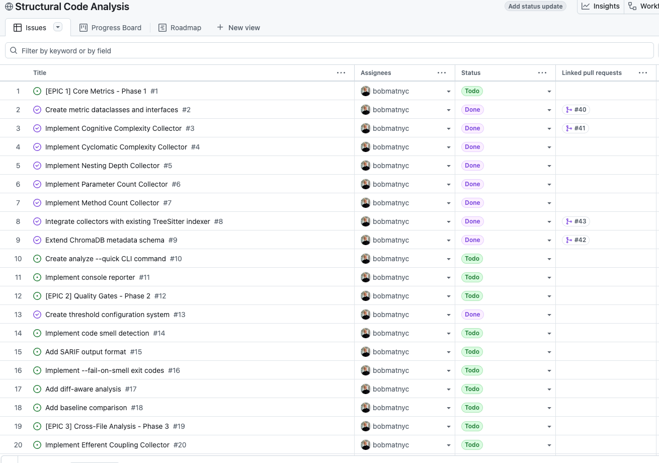 Just starting development on this now. Phase 1 targets core metrics, Phase 2 adds CI/CD integration with SARIF output, Phase 3 brings cross-file analysis for coupling and circular dependencies.