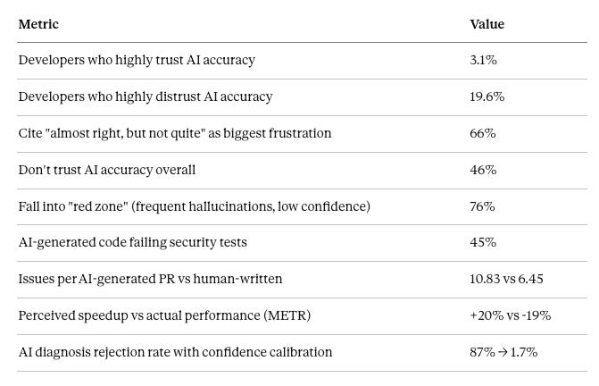 But here’s the thing that matters: 66% cite “AI solutions that are almost right, but not quite” as their biggest frustration. Not wrong. Almost right. That near-miss problem makes cognitive verification exhausting. You can’t skim AI output. You have to actually read it, and reading code is harder than writing it.