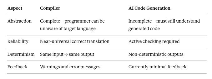 Microsoft Research’s Advait Sarkar challenges an easy mapping. His PPIG paper identifies crucial differences between compilers and AI code generation: