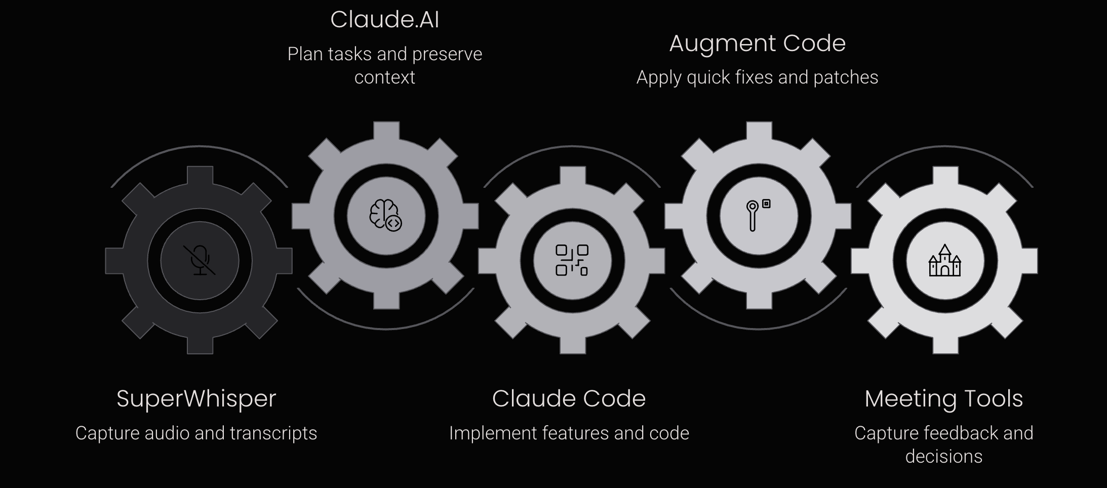 SuperWhisper dictates initial requirements into Claude.AI for planning. That planning flows to Claude Code for implementation. Augment Code handles edge cases and quick fixes. Meeting intelligence tools capture client feedback and discussions. Everything runs smoothly on the M4 with enough RAM to avoid bottlenecks.