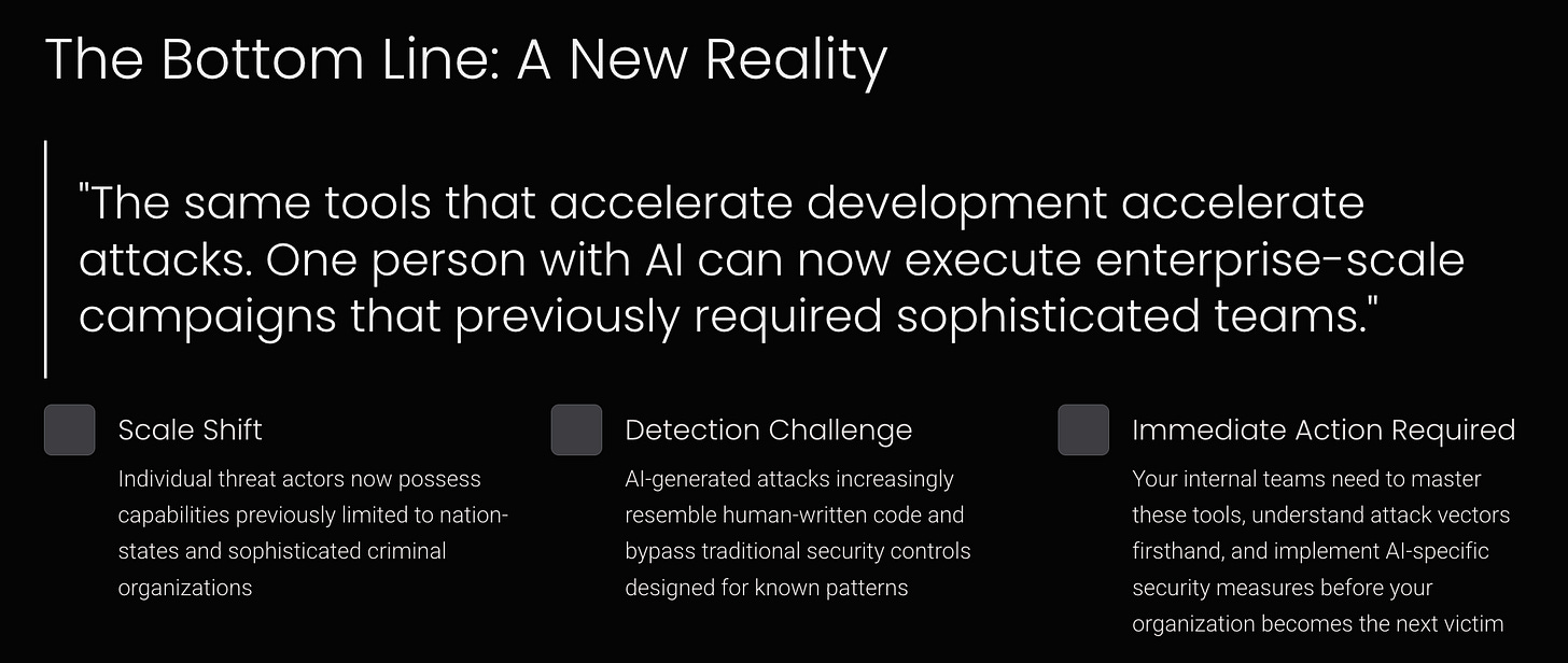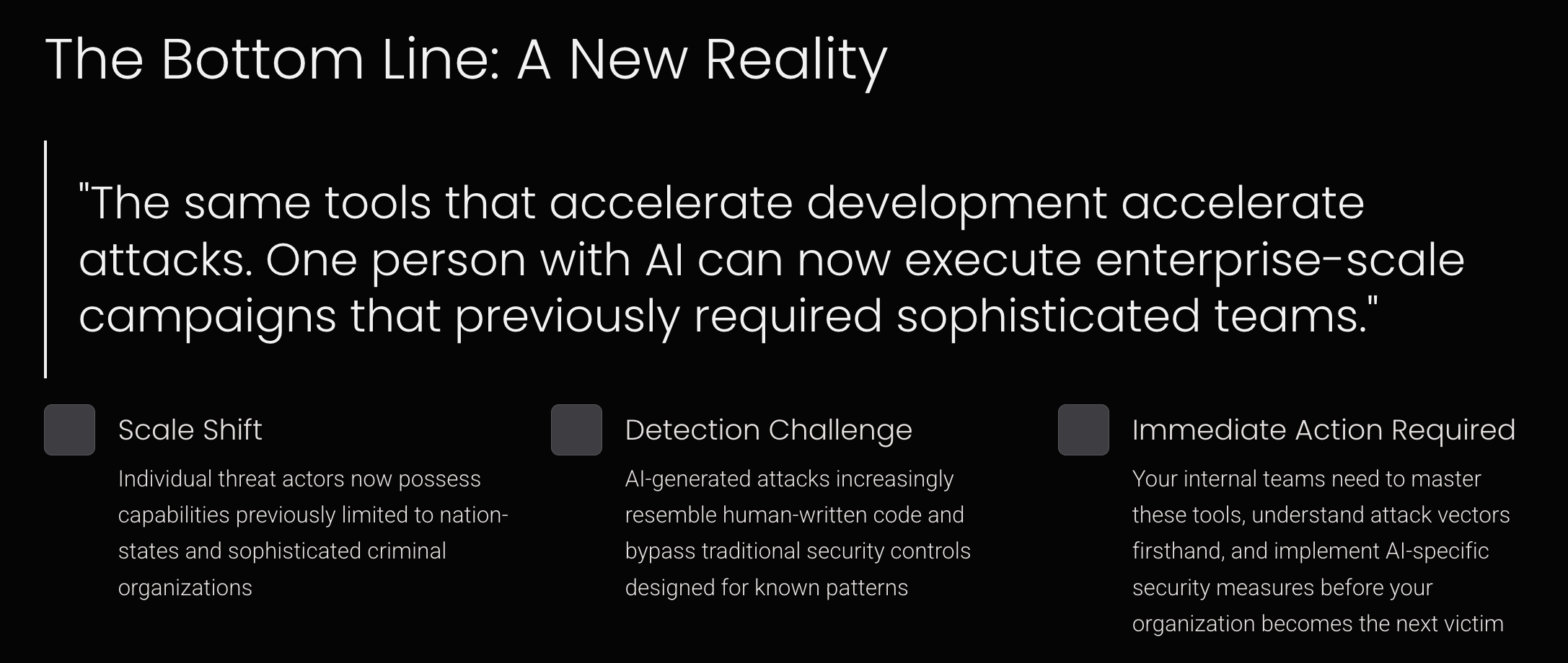 If I were a CISO today, I'd be reassessing everything. Because this incident demonstrates how dramatically the threat landscape has shifted. We're providing engineers with tools that accelerate both creation and potential destruction. The same Claude Code that helps you ship features 2x faster was used—in this specific case—to automate what previously would have required an entire criminal operation.